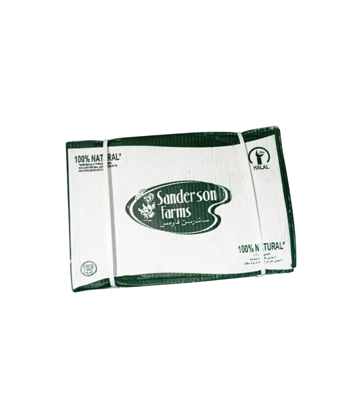 Caja de muslo de pollo congelado, marca “Sanderson Farms”. Presentación de 15 kg (33 lb). Carne jugosa, ideal para freír, guisar o asar. Perfecta para familias grandes o negocios.