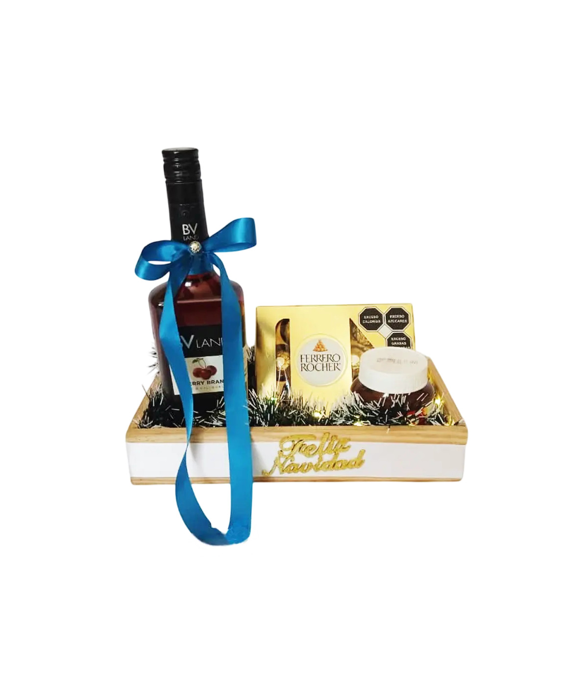 Cajita Feliz Navidad con brandy de cereza, bombones y crema de cacao y avellana. Un regalo dulce y especial.