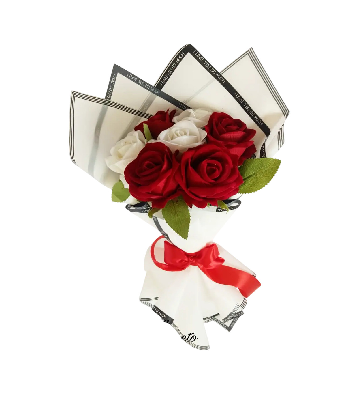 Ramo decorativo con 4 rosas rojas y 3 blancas. Un regalo elegante que transmite amor, respeto y buenos deseos.