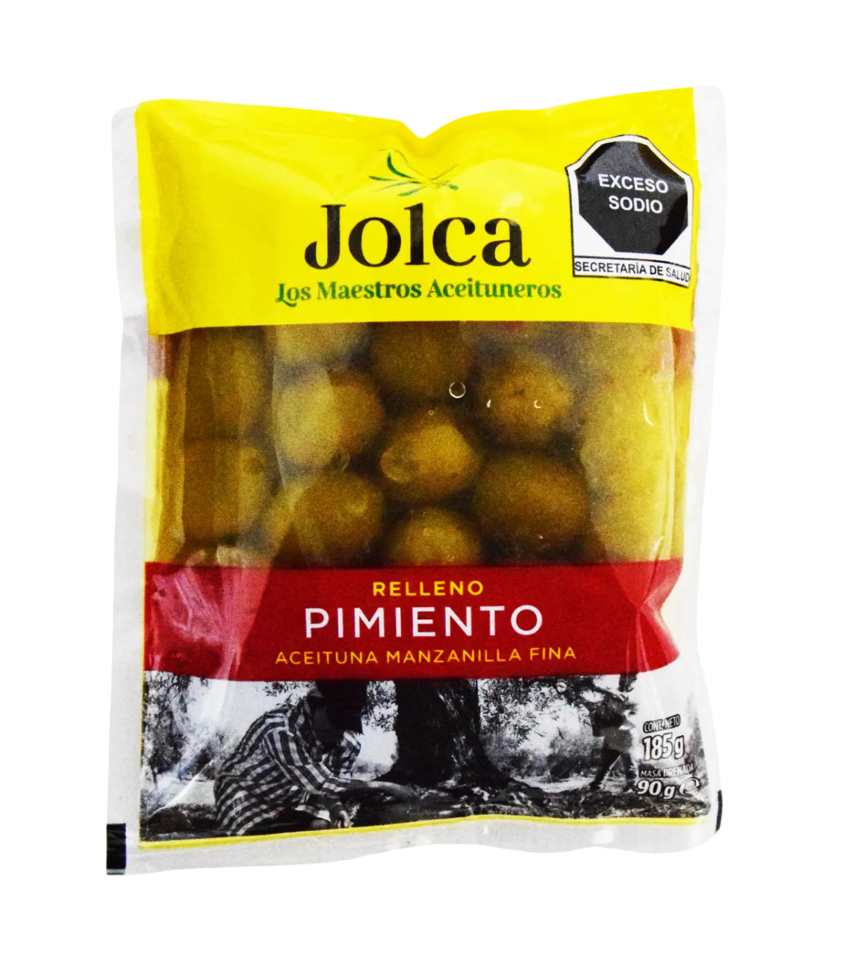 Aceitunas verdes rellenas de pimiento “Jolca”, presentación de 185 g. Muy valoradas en Cuba por su sabor equilibrado, textura firme y utilidad en picaderas y recetas caseras.