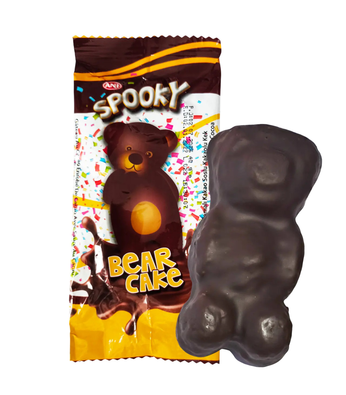 Bear Cake Spooky 40 g. Bizcochito suave cubierto de chocolate, perfecto para meriendas rápidas y deliciosas.