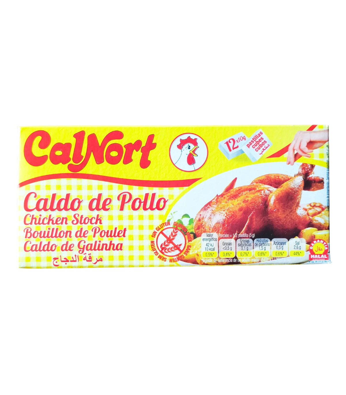 Caldo de Pollo Calnort en estuche de 12 pastillas, ideal para dar sabor a sopas, arroces, pastas y guisos caseros.