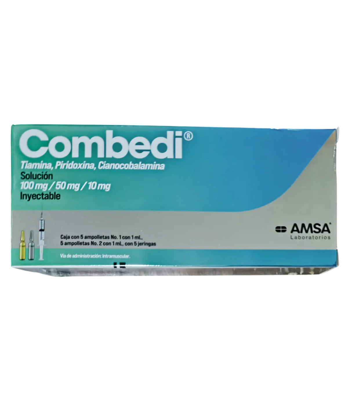 El COMBEDI (Vitamina B1, B6, B12 inyectables) es un suplemento multivitamínico utilizado para fortalecer el sistema nervioso, combatir el agotamiento físico y mental, y apoyar procesos de recuperación. Su presentación incluye 5 ampollas de tiamina (B1) y 5 ampollas combinadas de piridoxina (B6) y cianocobalamina (B12), listas para uso médico supervisado.